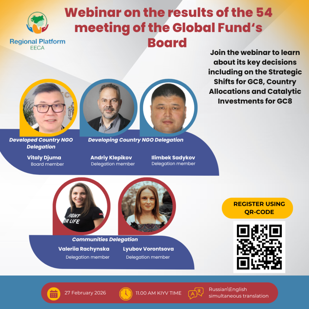 The aim of the webinar – is to provide the civil society and communities representatives from EECA region with an opportunity to receive the first-hand information about these and other key topics being discussed during this Board meeting, the decisions being made and discuss how these decisions could impact HIV and TB responses as well as availability of the Global Fund’s support for countries in our region.