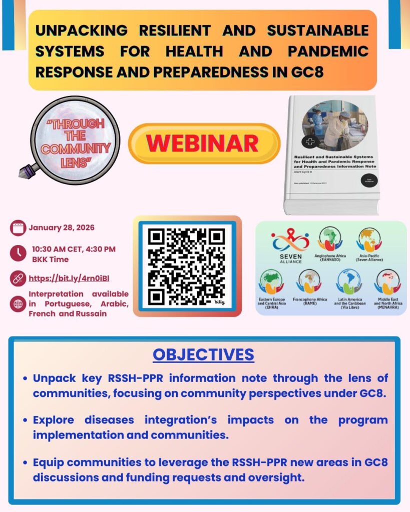 28 января 2026 года приглашаем вас принять участие в совместном вебинаре Региональных учебных центров: «Разбор вопросов создания устойчивых и жизнестойких систем для здравоохранения (RSSH) и обеспечения готовности к пандемиям и ответных мер (PPR) в рамках 8-го грантового цикла (GC8): взгляд со стороны сообществ». Этот вебинар, организованный Азиатско-Тихоокеанским региональным учебным центром (APRLH) на базе Seven Alliance в сотрудничестве с учебными центрами регионов Ближнего Востока и Северной Африки, англоязычной Африки, Восточной Европы и Центральной Азии, франкоязычной Африки, а также Латинской Америки и Карибского бассейна, направлен на наращивание потенциала сообществ и обеспечение содержательного участия их представителей в процессах 8-го грантового цикла (GC8) Глобального фонда.